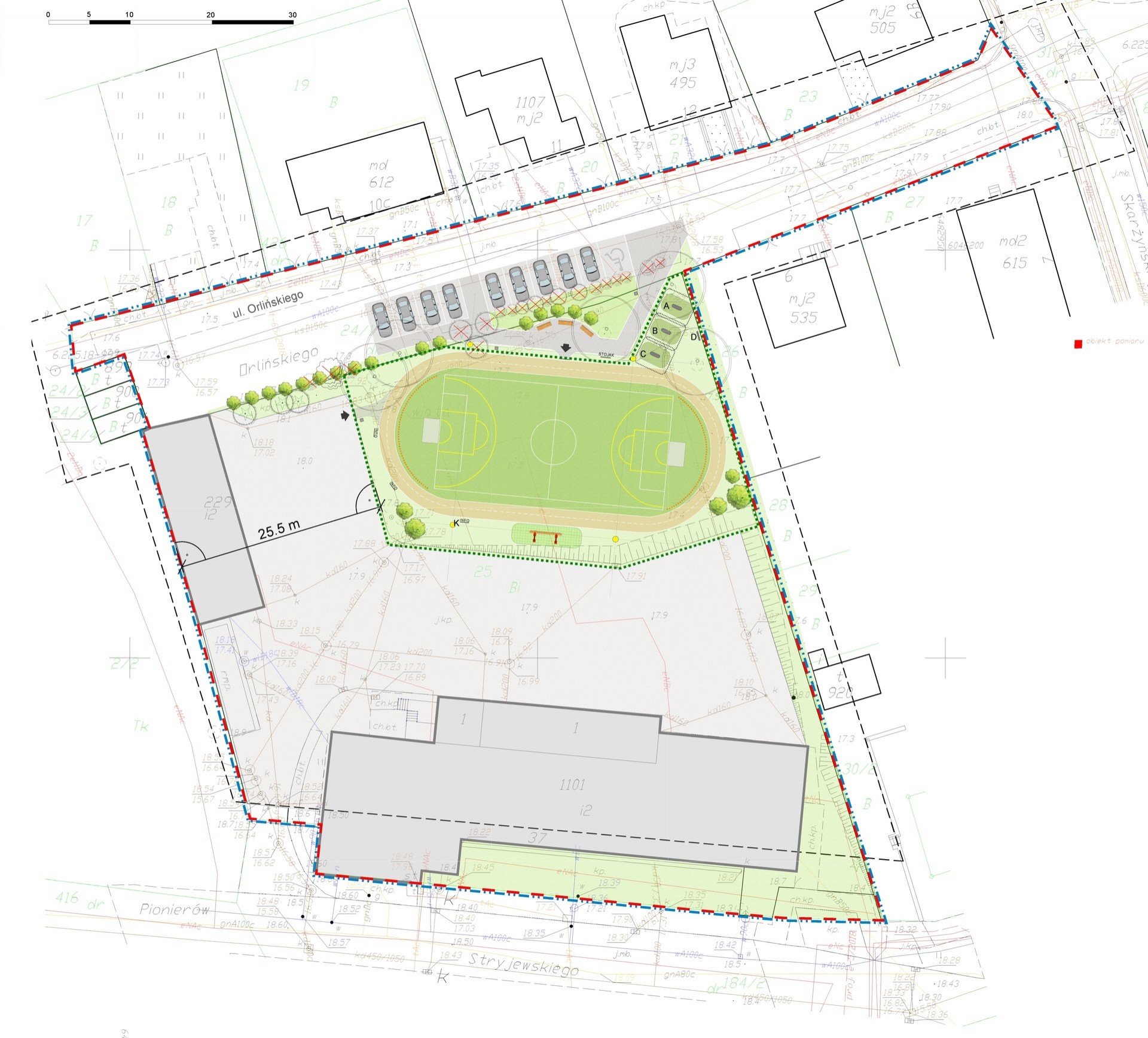 Na teren obiektu prowadzić będą dwa wejścia: główne od strony ul. Orlińskiego, drugie bezpośrednio z terenu postojowego Straży Pożarnej. W ramach inwestycji przebudowany będzie odcinek ulicy Orlińskiego - powstanie 10 miejsc postojowych, ciągi piesze wyłożone zostaną kostką betonową. Teren będzie ogrodzony i oświetlony lampami solarnymi. Zamontowane zostaną także elementy małej architektury jak ławki, kosze na śmieci, stojak na rowery. Teren monitorowała będzie kamera, podłączona do systemu monitoringu straży pożarnej. Obiekt będzie całkowicie przyjazny dla osób niepełnosprawnych (brak barier terenowych).
