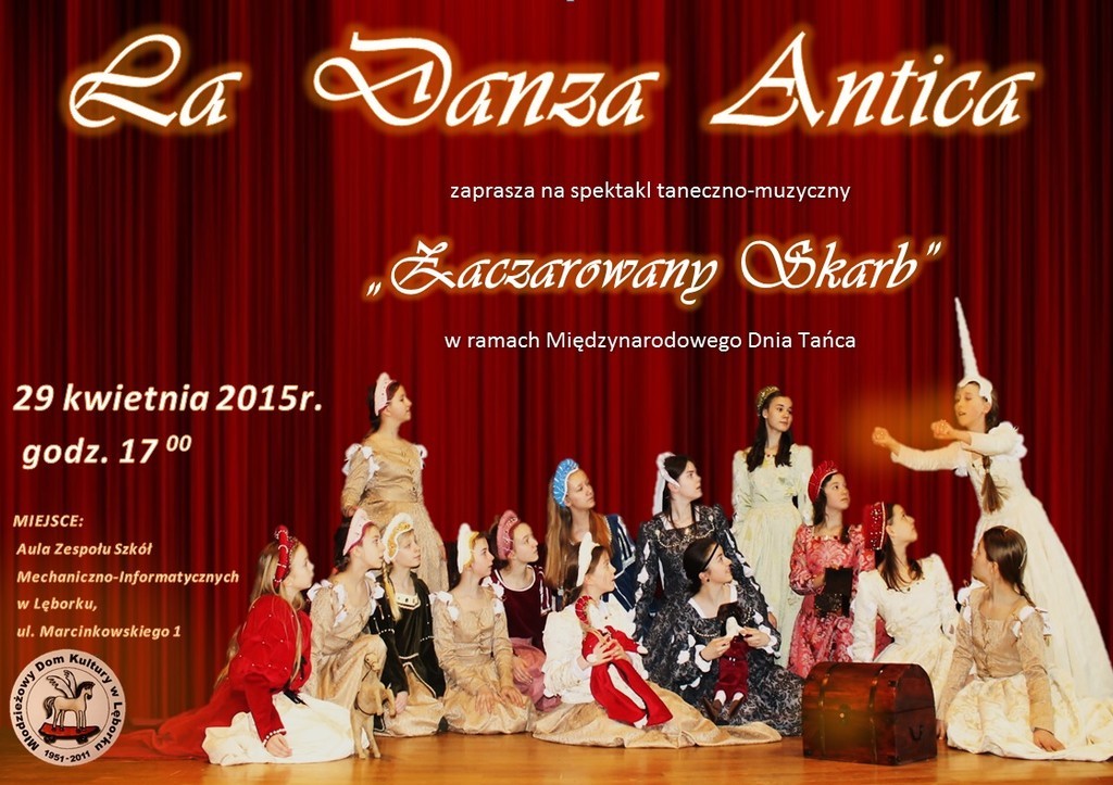 Młodzieżowy Dom Kultury o zespół „La Danza Antica” zapraszają na spektakl taneczno-muzyczny „Zaczarowany skarb” w ramach Międzynarodowego Dnia Tańca. Spektakl zaprezentowany będzie 29 kwietnia o godz. 17.00 w auli Zespołu Szkół Mechaniczno-Informatycznych.