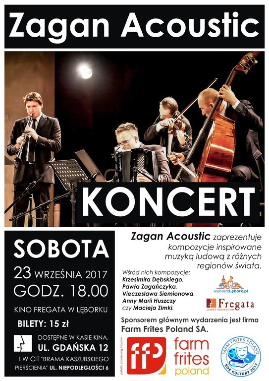 Lęborskie Centrum Kultury „Fregata” zaprasza na koncert kwartetu „Zagan Acoustic”. To wyjątkowe wydarzenie muzyczne odbędzie się w sobotę, 23 września w sali kinowej przy ulicy Gdańskiej 12 w Lęborku. Początek o godzinie 18.00.