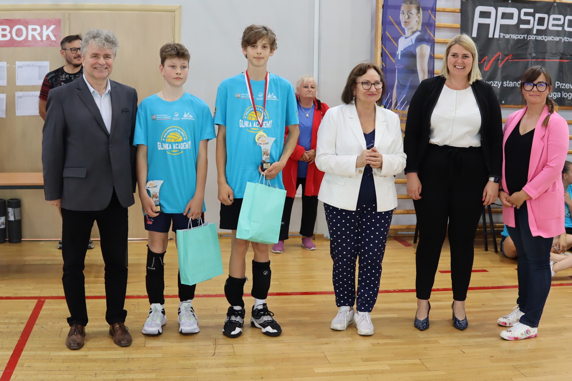 Uroczyste podsumowanie turnieju uświetnili swoją obecnością: Burmistrz Miasta Lębork Witold Namyślak , Starosta Powiatu Lęborskiego Alicja Zajączkowska , Zastępca Wójta Gminy Nowa Wieś Lęborska Monika Włusek oraz właściciele firmy A.P Sped Przemysław i Agnieszka Gajkowscy.