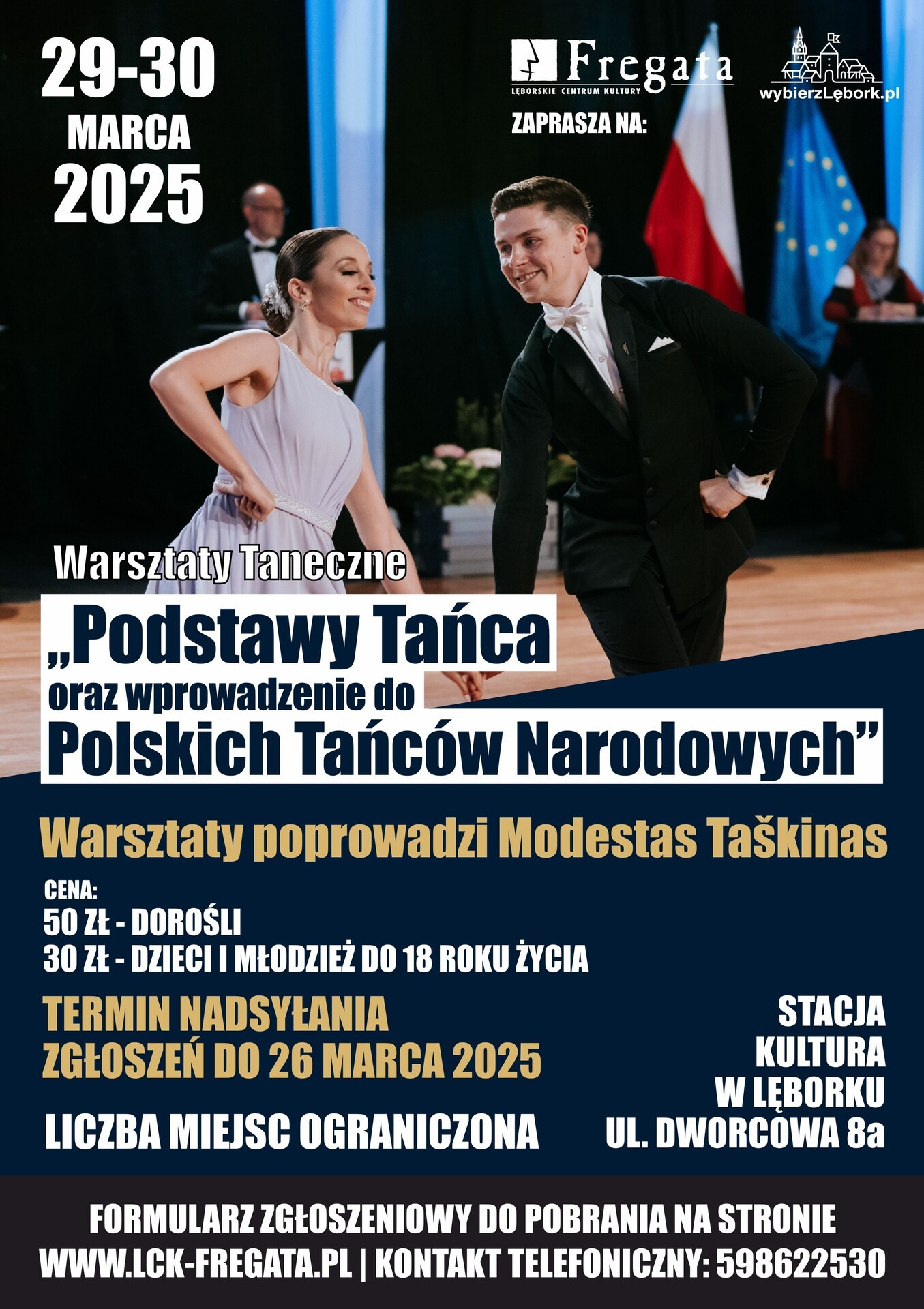 Lęborskie Centrum Kultury "Fregata" zaprasza na kolejne zajęcia pod tytułem "Podstawy tańca oraz wprowadzenie do polskich tańców narodowych”. Warsztaty odbędą się 29 i 30 marca 2025 roku w Stacji Kultura w Lęborku (ul. Dworcowa 8a, budynek PKP). Zajęcia poprowadzi Modestas Taškinas - mistrz Tańców Polskich, tancerz i instruktor w Zespole Pieśni i Tańca Uniwersytetu Gdańskiego "Jantar". Liczba miejsc jest ograniczona.