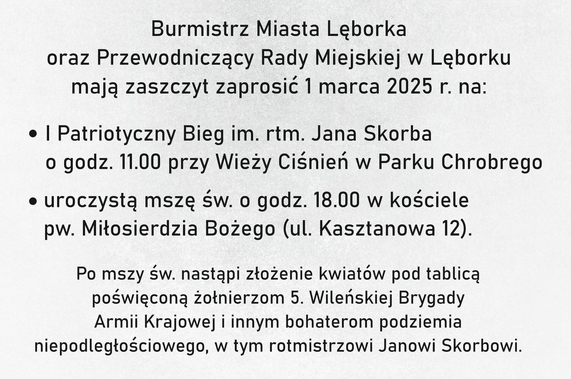 Zbliża się 1 marca. Od 15 lat tego dnia obchodzony jest w Polsce Narodowy Dzień Pamięci Żołnierzy Wyklętych. Na wspólne obchody w Lęborku zapraszają burmistrz miasta Jarosław Litwin i przewodniczący Rady Miejskiej Radosław Zimnowoda.