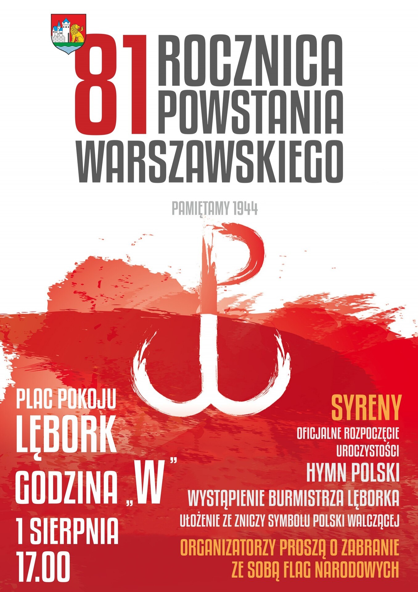 W godzinę „W” włączone zostaną syreny alarmowe, aby uczcić pamięć uczestników i ofiar tego ważnego wydarzenia w historii Polski. Następnie odśpiewany zostanie Hymn Państwowy Rzeczypospolitej Polskiej. Okolicznościowe wystąpienie wygłosi burmistrz Miasta Lęborka, po którym zapraszamy do ułożenia ze zniczy symbolu Polski Walczącej. Prosimy także o zabranie ze sobą flag narodowych.