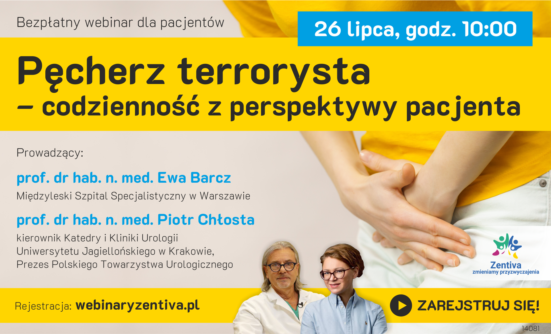 W ramach kampanii społecznej Zentiva – Zmieniamy Przyzwyczajenia serdecznie zapraszamy na bezpłatny webinar dla pacjentów z chorobami urologiczno-ginekologicznymi. Temat spotkania to: „Pęcherz terrorysta - codzienność z perspektywy pacjenta”. Webinar poprowadzą: prof. dr hab. n. med. Ewa Barcz, Międzyleski Szpital Specjalistyczny w Warszawie oraz prof. dr hab. n. med. Piotr Chłosta, kierownik Katedry i Kliniki Urologii Uniwersytetu Jagiellońskiego w Krakowie, Prezes Polskiego Towarzystwa Urologicznego.