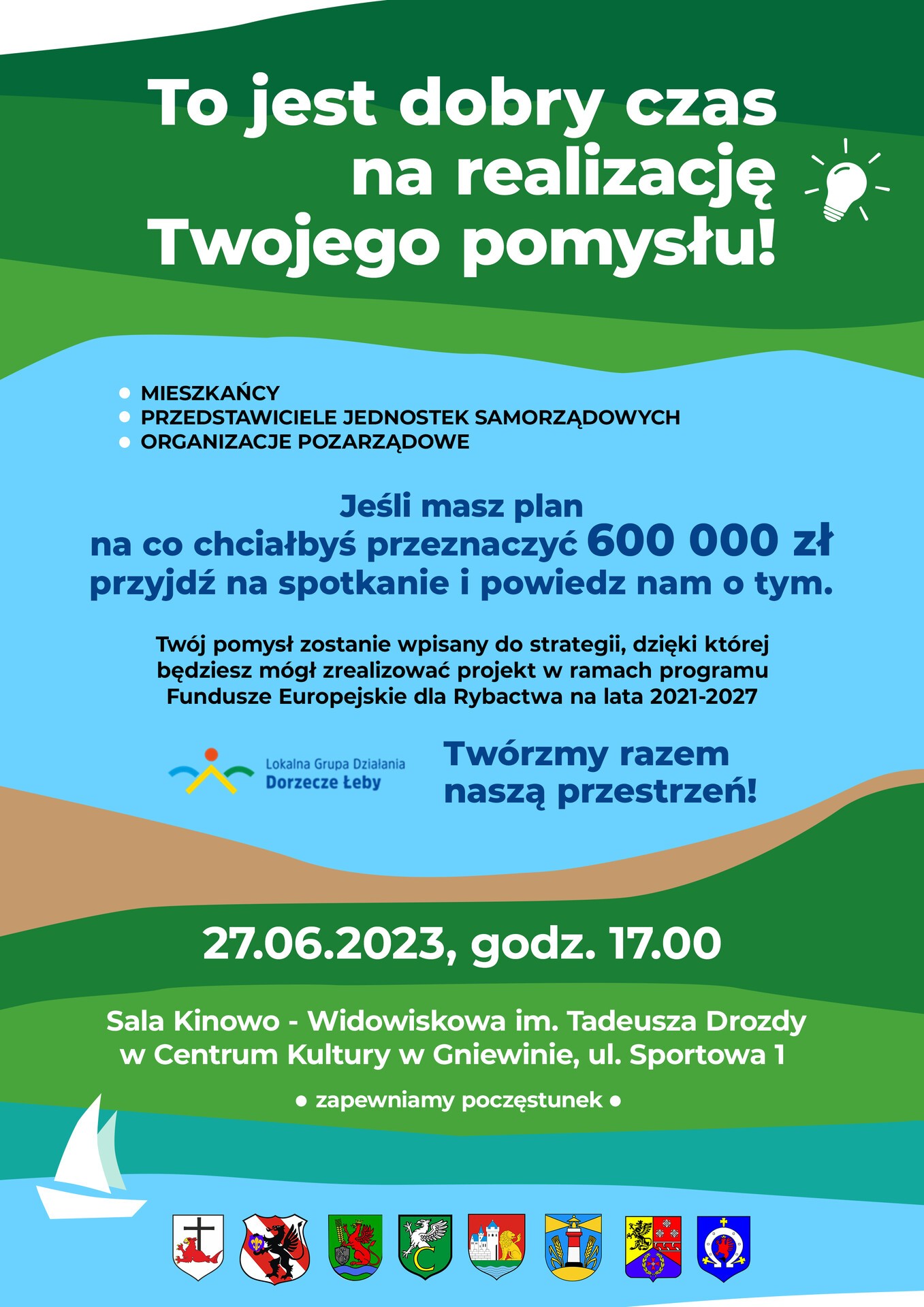 Lokalna Grupa Działania „Dorzecze Łeby” zaprasza na spotkanie dotyczące przygotowania Lokalnej Strategii Rozwoju, które odbędzie się o godzinie 17.00 w dniu 27.06.2023 roku w Sali Kinowo-Widowiskowej im. Tadeusza Drozdy, w Centrum Kultury w Gniewinie, ul. Sportowa 1. Będzie to kolejne z 10 zaplanowanych spotkań, które mają na celu uwzględnienie potrzeb samorządów, przedsiębiorców, organizacji pozarządowych oraz mieszkańców przy tworzeniu budżetu w ramach „Funduszy Europejskich dla Rybactwa” w nowej perspektywie finansowej na lata 2021-2027.