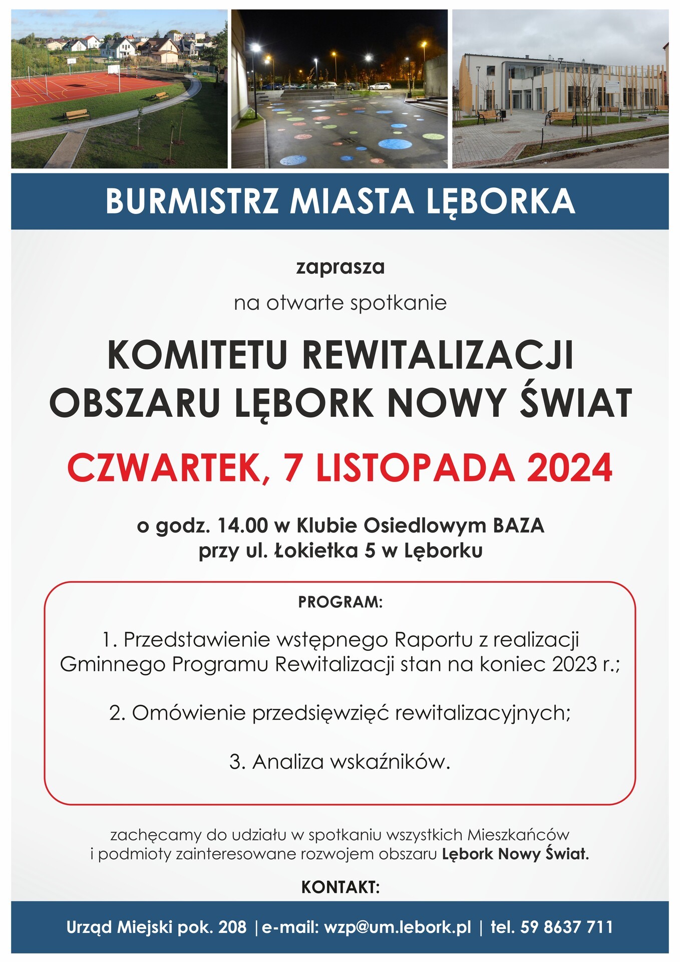 Komitet Rewitalizacji obszaru Lębork NOWY ŚWIAT zaprasza na otwarte spotkanie Komitetu Rewitalizacji w dniu 7 listopada 2024 roku (czwartek) o godz. 14.00 do Klubu Osiedlowego BAZA przy ul. Łokietka 5 w Lęborku.
