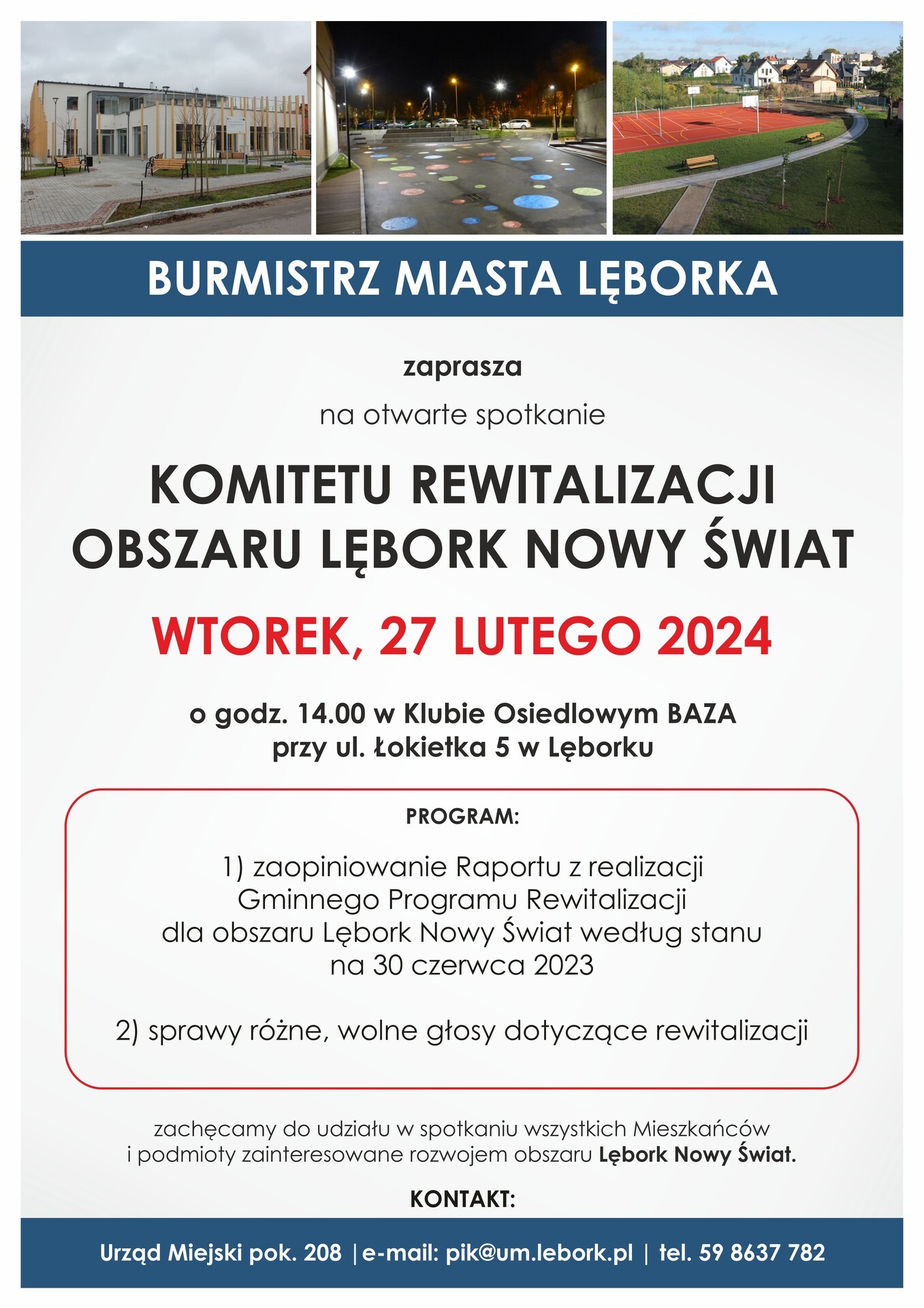 Komitet Rewitalizacji obszaru Lębork NOWY ŚWIAT zaprasza na otwarte spotkanie Komitetu Rewitalizacji w dniu 27 lutego 2024 roku (wtorek) o godz. 14.00 do Klubu Osiedlowego BAZA przy ul. Łokietka 5 w Lęborku.