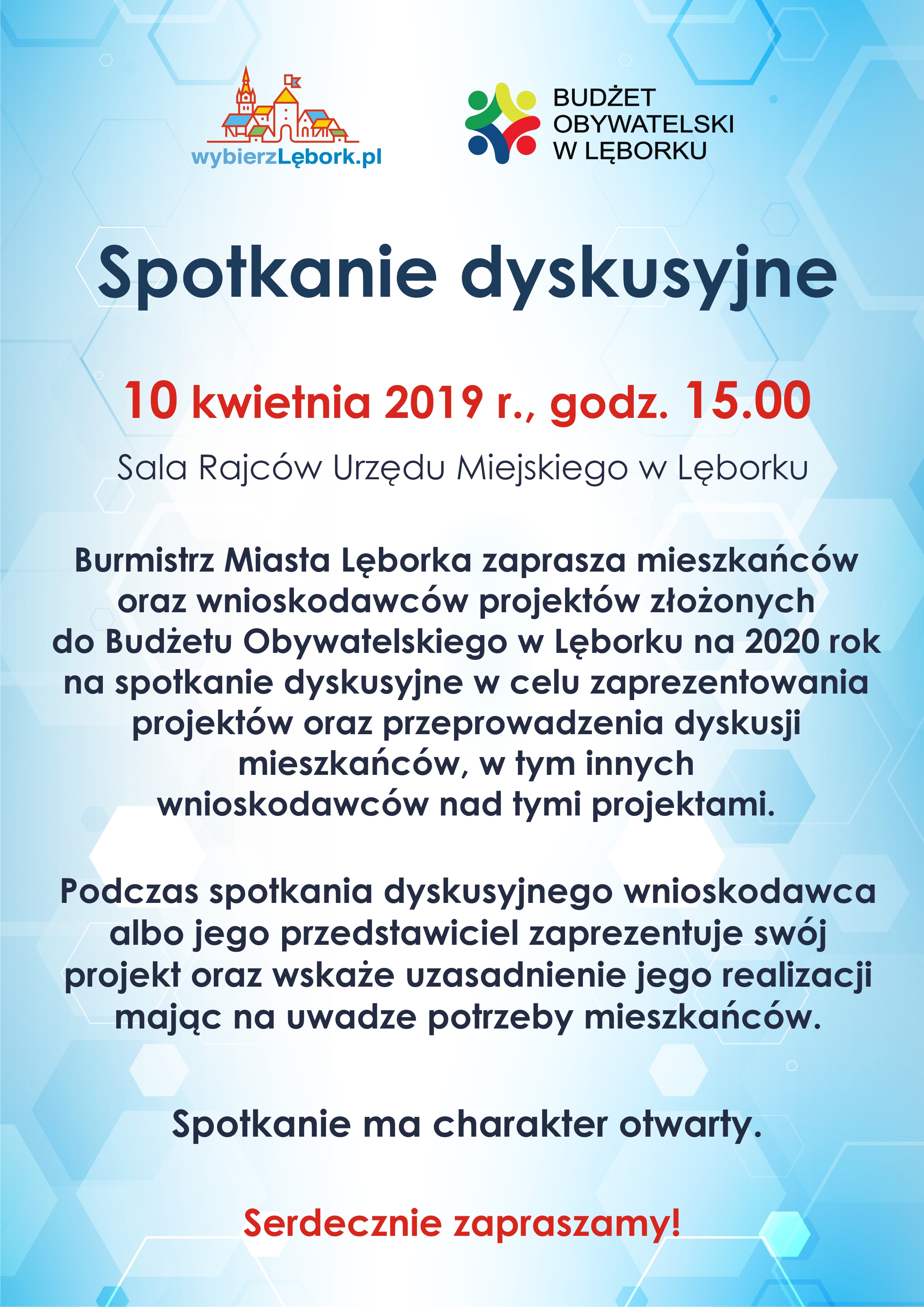 Serdecznie zapraszamy na Spotkanie dyskusyjne mieszkańców oraz wnioskodawców projektów, które odbędzie się w dniu 10 kwietnia 2019 r. o godz. 15.00 na Sali Rajców Urzędu Miejskiego w Lęborku.