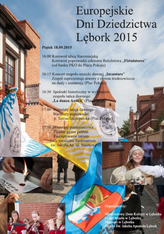 W piątek 18 września br. w ramach Europejskich Dni Dziedzictwa na placu Pokoju w Lęborku odbędą się Warsztaty i Pokazy Tańców Dawnych oraz warsztaty z średniowiecznego piśmiennictwa i pieczętowania lakiem. Start imprezy o godz. 16 spod banku PKO przy ul. Staromiejskiej.