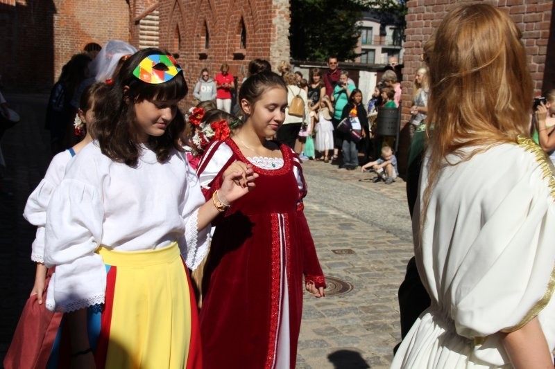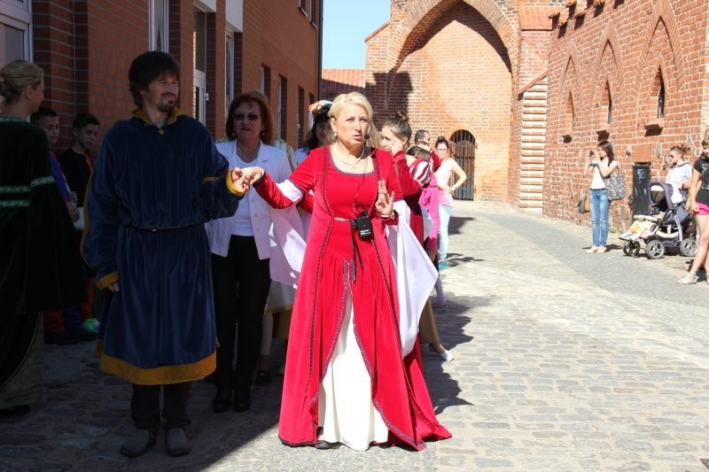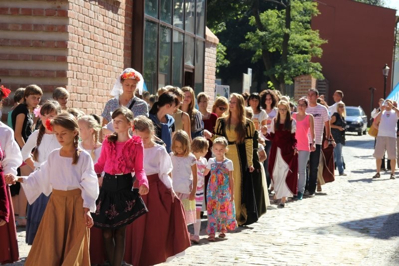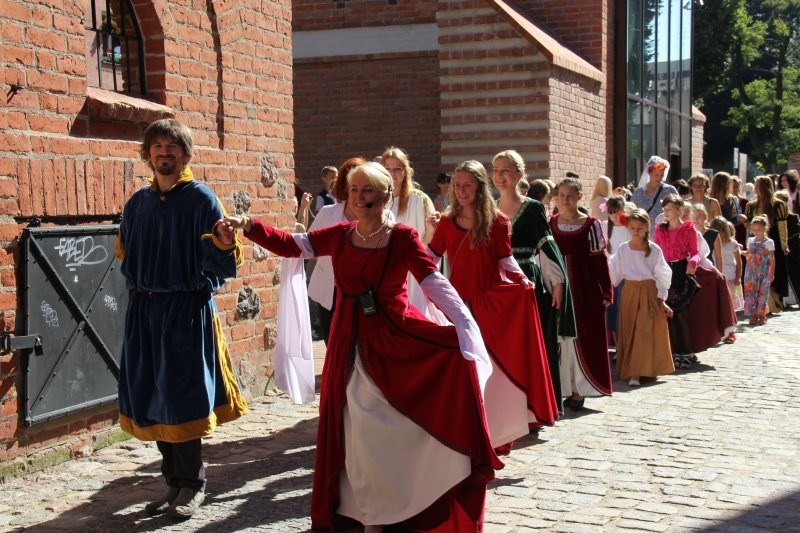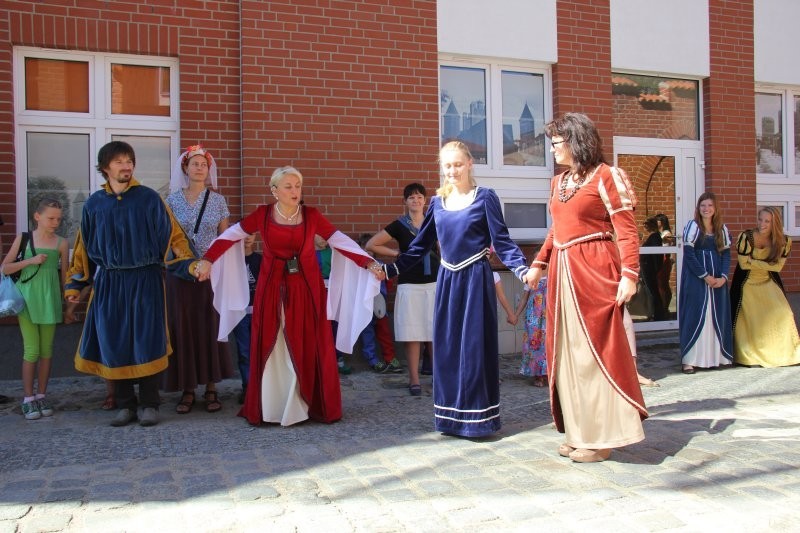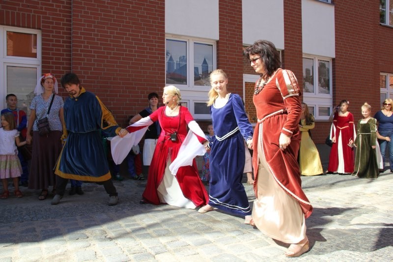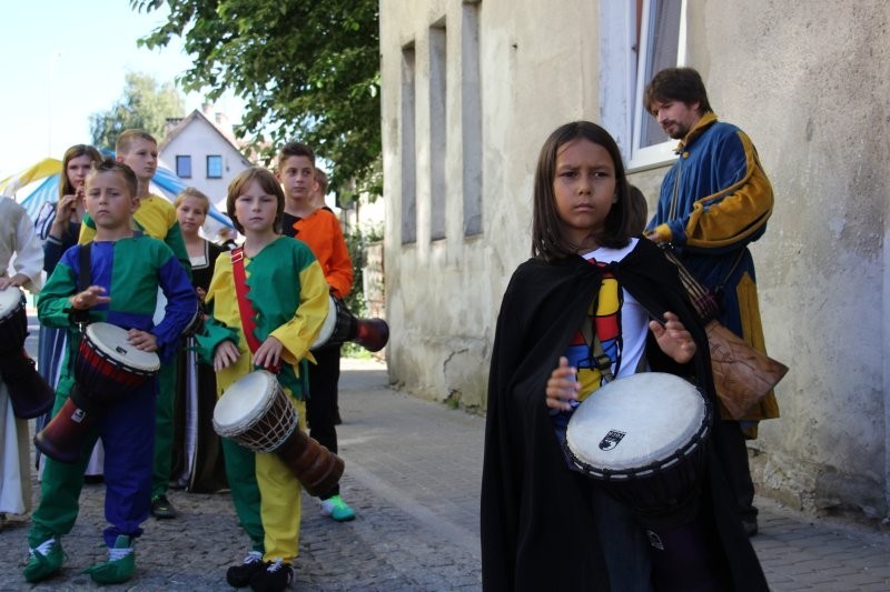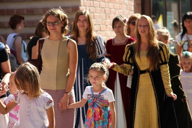 Korowód z bębniarzami, akrobatami wyruszył o godz. 11 z rogu ulicy Staromiejskiej i Skłodowskiej. Po drodze barwna kawalkada odwiedziła rycerzy w baszcie nr 32, gdzie można było poznać tajniki średniowiecznego życia. Taneczne warsztaty odbyły się przed przeszkloną basztą nr 24, udostępnioną zresztą do zwiedzania. Dopisała pogoda i uczestnicy. Zebrani uczyli się tańczyć Pavanę i Branle. Zespół muzyki Dawnej INCANTARE zaprezentował swój nowy instrument muzyczny fidelę basową. Wystąpiła także grupa bębniarzy SLAP prowadzona przez Piotra Fugiela. Kolejną atrakcją były warsztaty pisania „Ze starego kałamarza” oraz pieczętowanie lakiem. Aula im. Jana Pawła II w domu parafialnym kościoła św. Jakuba Ap. przez ponad godzinę zamieniła w centrum dawnego piśmiennictwa.