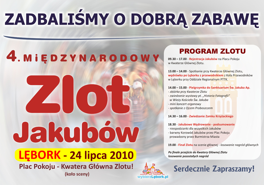 W tym roku Kwatera Główna Zlotu mieścić się będzie na Pl. Pokoju, koło sceny. Każdy zarejestrowany zlotowicz otrzyma identyfikator uprawniający do udziału w wieczornym finale Zlotu i losowaniu cennych nagród, kupon rabatowy na zakupy w lęborskich sklepach oraz atrakcyjny zestaw upominkowy. Na pierwszych 100 Jakubów czeka szczególna niespodzianka.