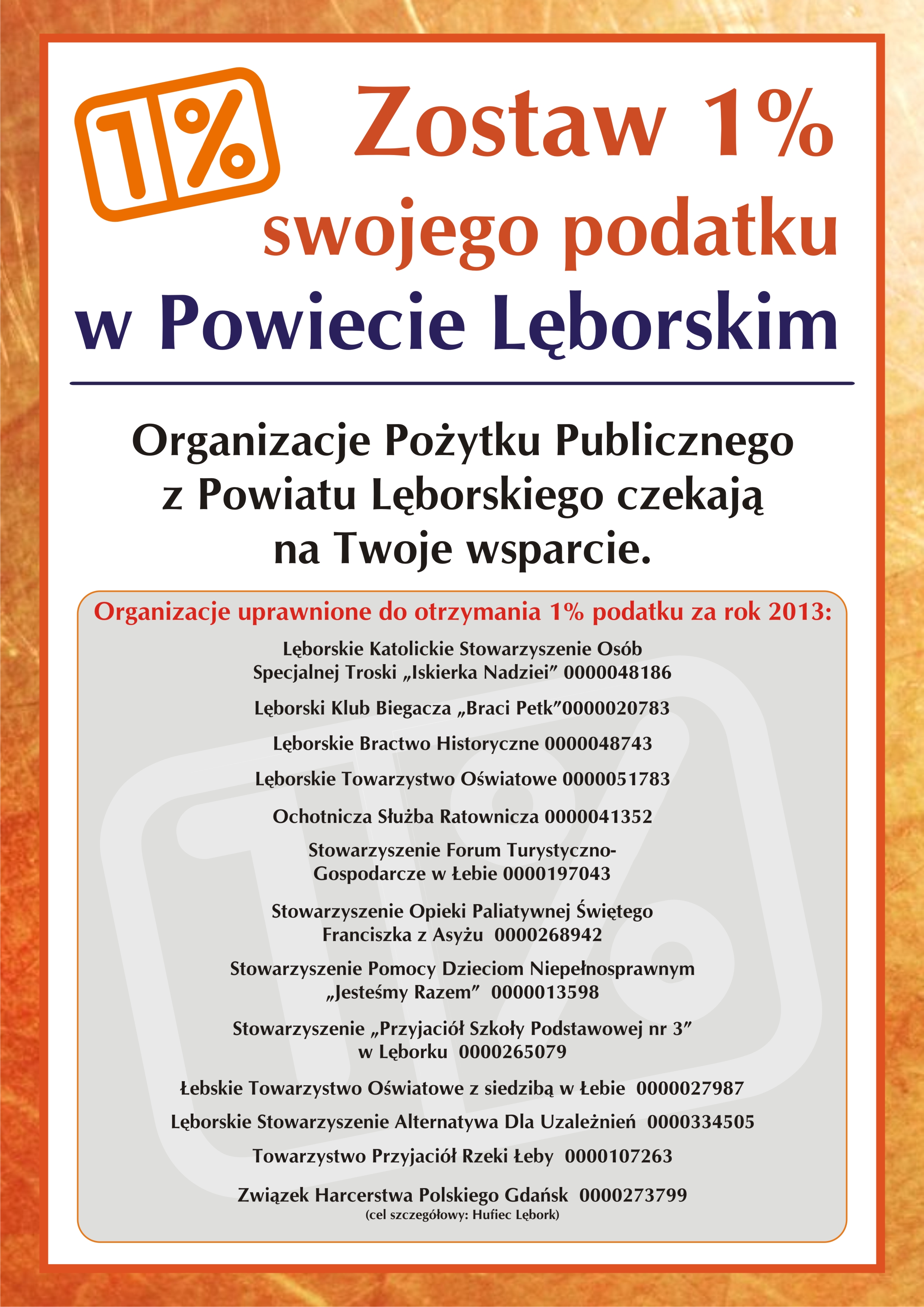 Z roku na rok zwiększa się liczba podatników korzystających z możliwości odpisu 1% podatku. Zdecydowana większość środków przypada dużym ogólnopolskim fundacjom i stowarzyszeniom, które prowadzą szeroko zakrojone działania reklamowe i akcje informacyjne związane z przekazywaniem pieniędzy z podatku na ich rzecz. Część tych środków wraca na teren Powiatu Lęborskiego, warto jednak dodatkowo wspomóc lokalne organizacja pozarządowe, które nie mają wystarczająco dużo środków na przeprowadzanie kampanii reklamowych.