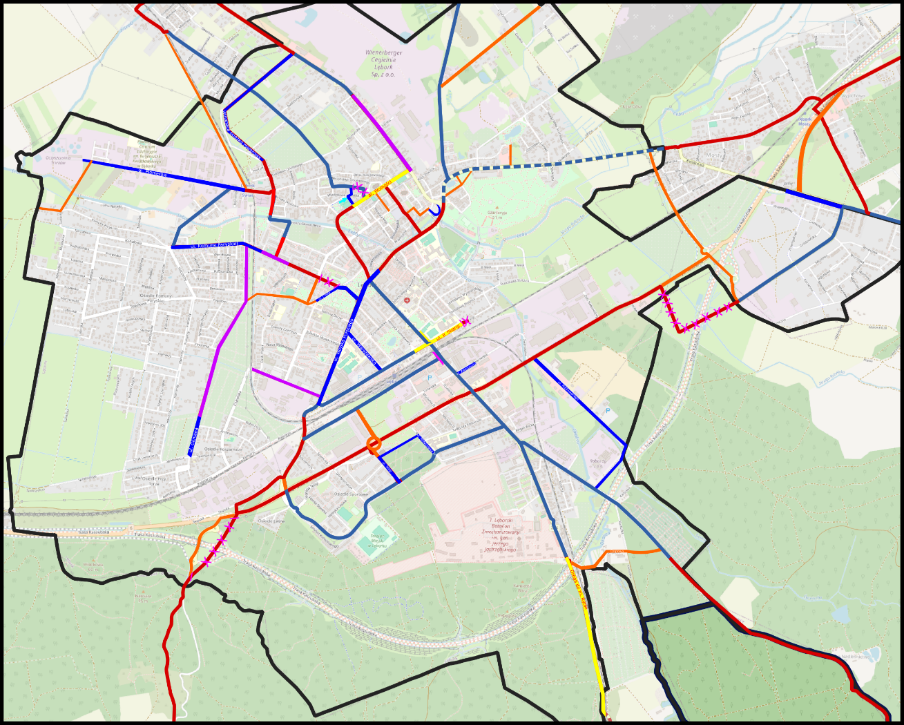 Na załączonej mapie Lęborka naniesiono planowane do realizacji w najbliższym czasie drogi rowerowe: