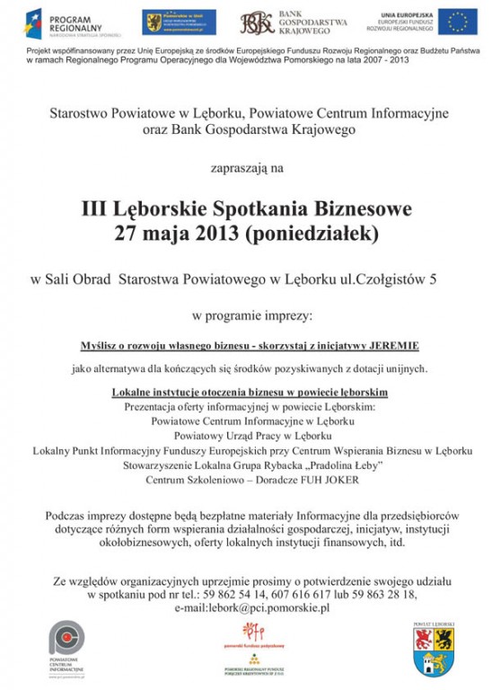 W dniu 27 maja 2013 o godz. 11.00 odbędą się III Lęborskie Spotkania Biznesowe w Sali Obrad Starostwa Powiatowego ul. Czołgistów 5, organizowane przez Starostwo Powiatowe przy współudziale Powiatowego Centrum Informacyjnego z Lęborka i Banku Gospodarstwa Krajowego.