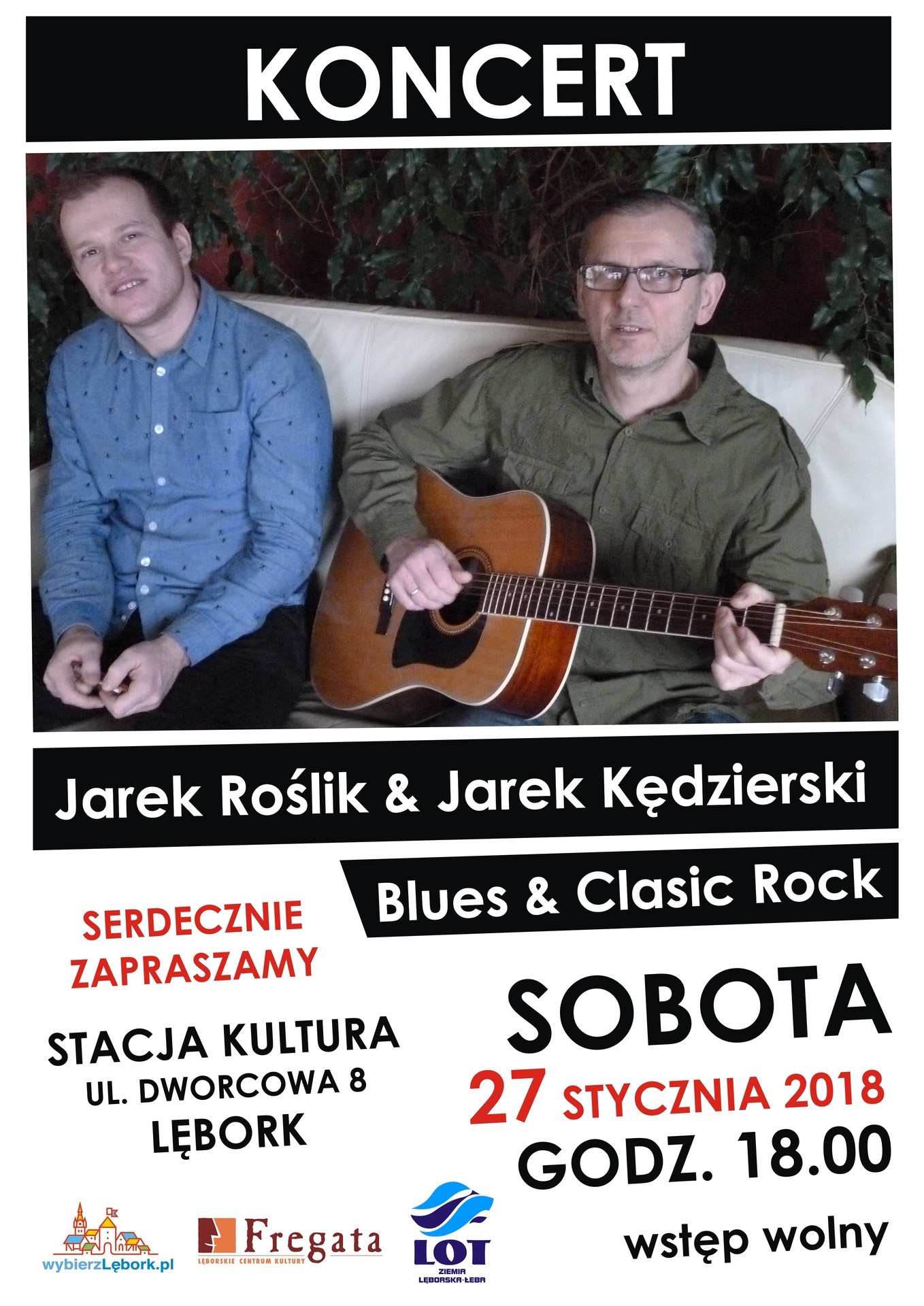 Serdecznie zapraszamy na Koncert Blues & Classic Rock, który poprowadzą Jarek Roślik i Jarek Kędzierski. Koncert odbędzie się w sobotę 27.01.2018 r. o godzinie 18.00 w Stacji Kultura - ul. Dworcowa 8 Lębork. Wstęp wolny.