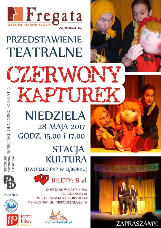 Lęborskie Centrum Kultury „Fregata” zaprasza na kolejne przedstawienie z cyklu „Niedzielne spotkania z teatrem”. 28 maja 2017 roku Teatr „Władca Lalek” zaprezentuje w Stacji Kultura (dworzec PKP, ul. Dworcowa 8) spektakl pod tytułem „Czerwony Kapturek”. W związku z bardzo dużym zainteresowaniem, przedstawienie zostanie zaprezentowane dwa razy: o godzinie 15 i 17. Bilety w cenie 8 złotych dostępne są w Kasie Kina przy ulicy Gdańskiej oraz w CIT przy alei Niepodległości 6. Liczba biletów jest ograniczona.