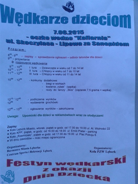 Serdecznie zapraszamy na coroczony dzień dziecka. W programie przewidziane zawody wędkarskie oraz konkursy dodatkowe. Więcej informacji w siedzibie koła. Liczba miejsc ograniczona. Zapraszamy.